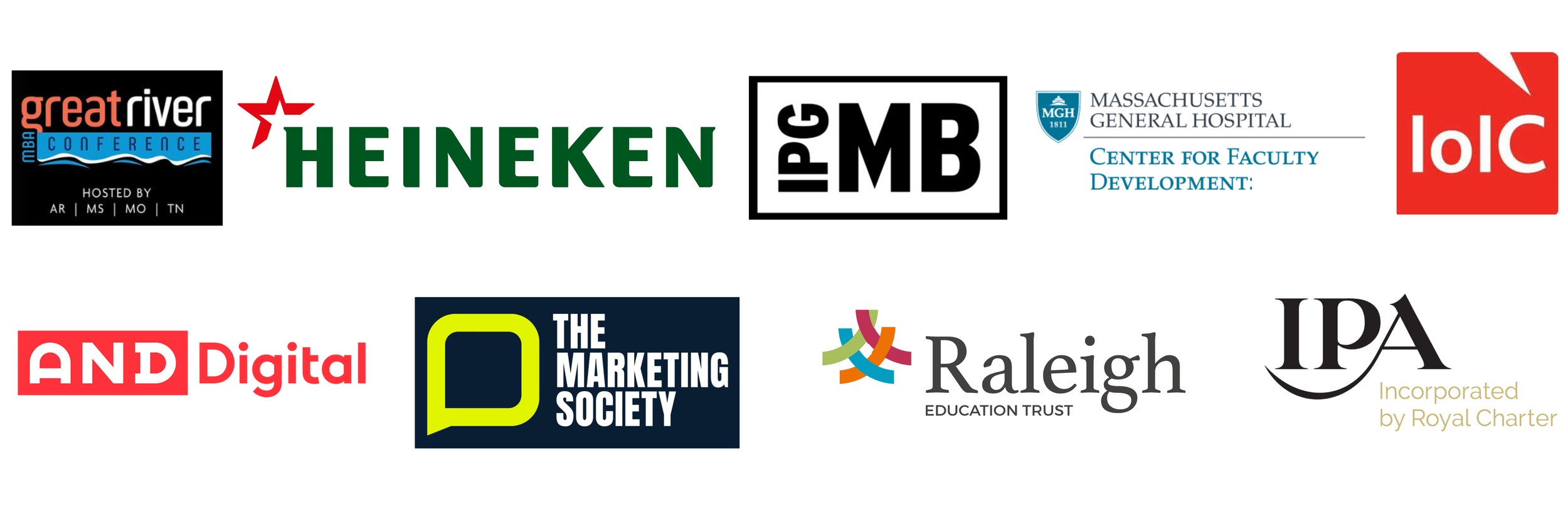 Heineken UK, Mortgage Brokers Association, Institute of Internal Communication, National MI, Mass General Center for Faculty Development, AND Digital, and the Institute of Practitioners of Advertising
